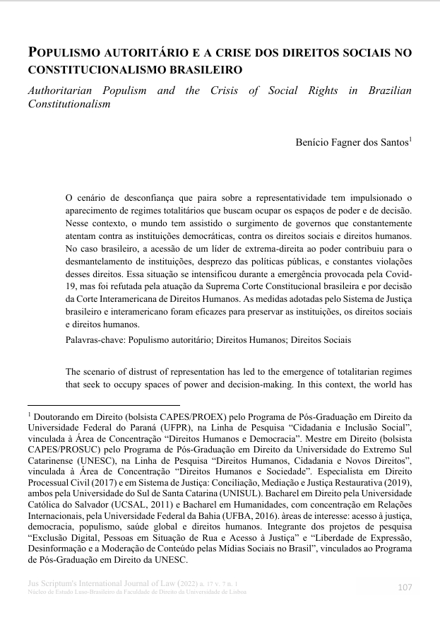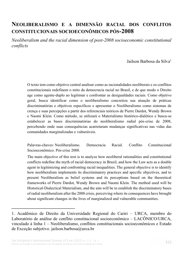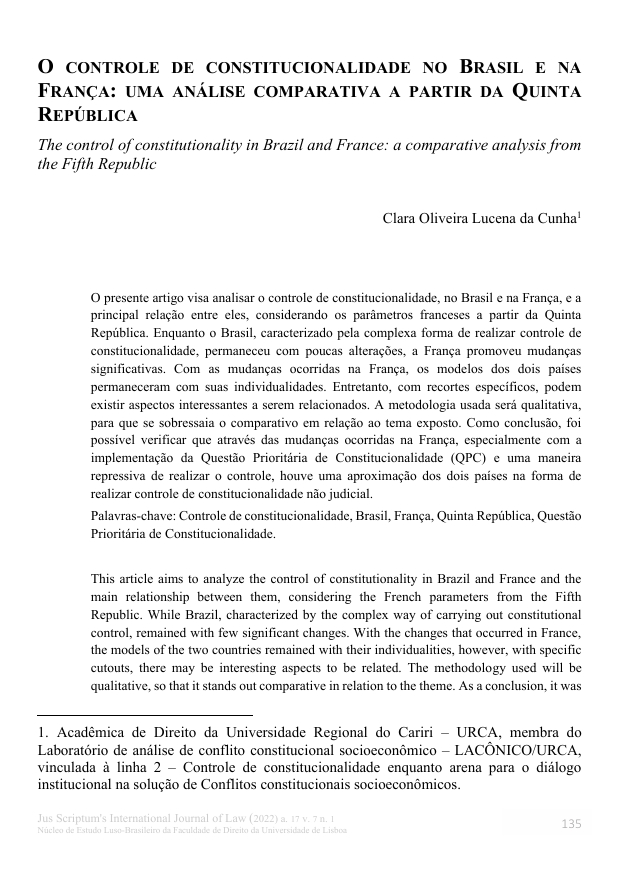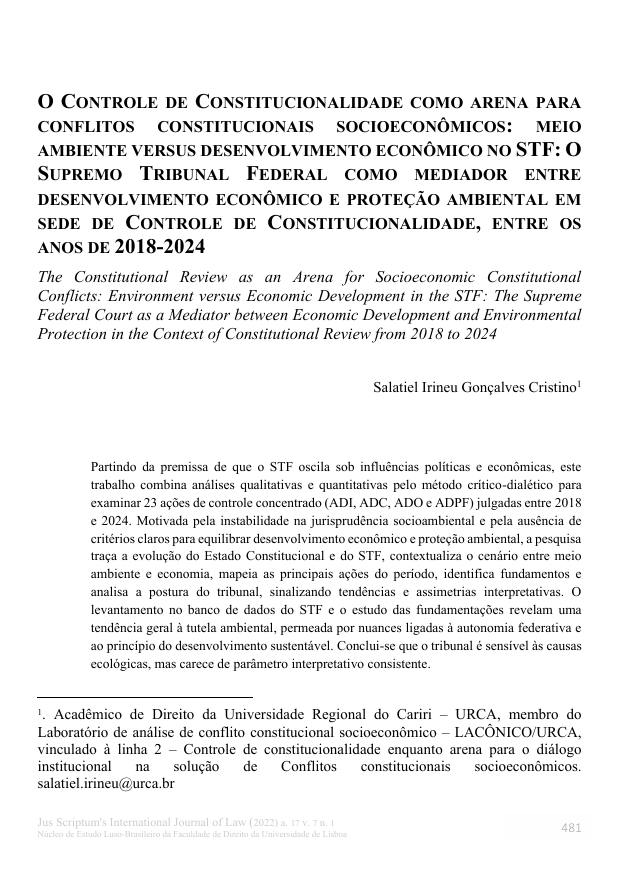 Na sua edição especial de 2025, abrangendo o Volume 10, a Jus Scriptum's International Journal of Law, publicação do Núcleo de Estudo Luso-Brasileiro da Faculdade de Direito da Universidade de Lisboa, apresenta os Analíticos do Grupo de Pesquisa em Conflitos Constitucionais Socioeconômicos, coordenado pelo Prof. Dr. Djamiro Ferreira Acipreste Sobrinho em parceria com o LACÔNICO - Laboratório de Análise de Conflito Constitucional Socioeconômico da Universidade Regional do Cariri.