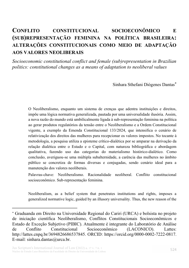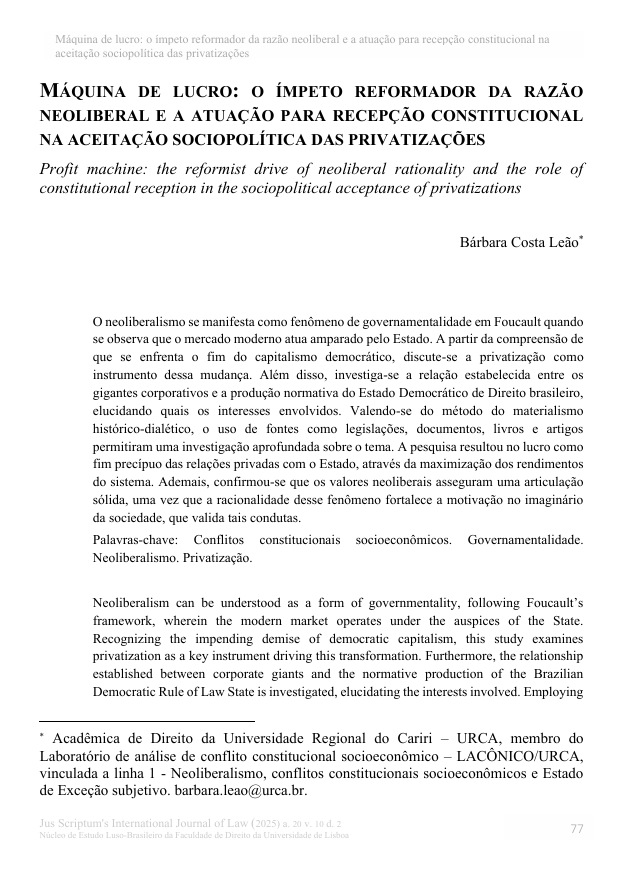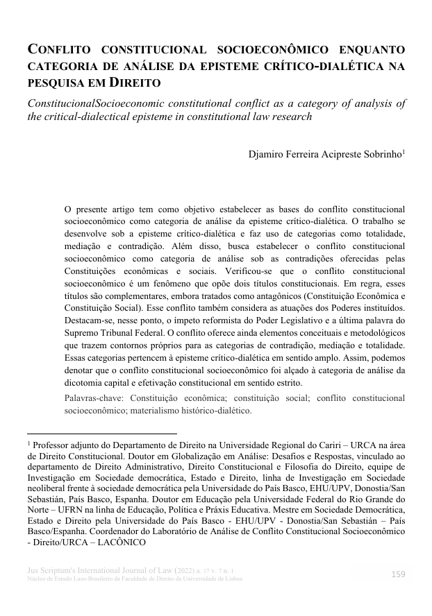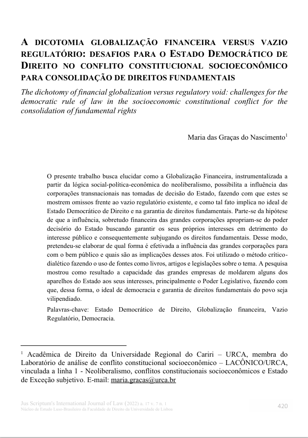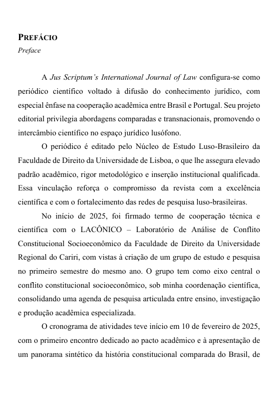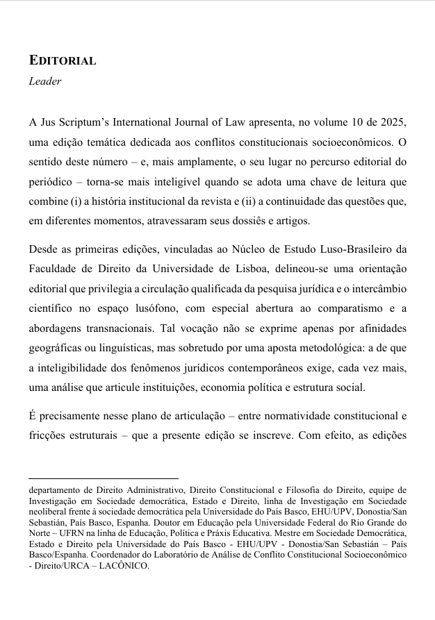 Na sua edição especial de 2025, abrangendo o Volume 10, a Jus Scriptum's International Journal of Law, publicação do Núcleo de Estudo Luso-Brasileiro da Faculdade de Direito da Universidade de Lisboa, apresenta os Analíticos do Grupo de Pesquisa em Conflitos Constitucionais Socioeconômicos, coordenado pelo Prof. Dr. Djamiro Ferreira Acipreste Sobrinho em parceria com o LACÔNICO - Laboratório de Análise de Conflito Constitucional Socioeconômico da Universidade Regional do Cariri.
