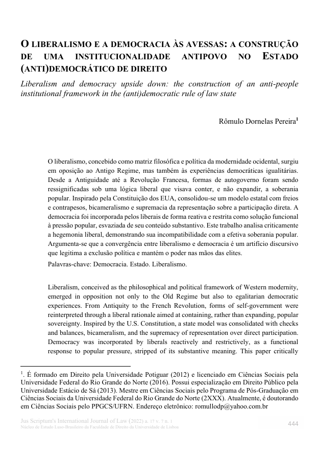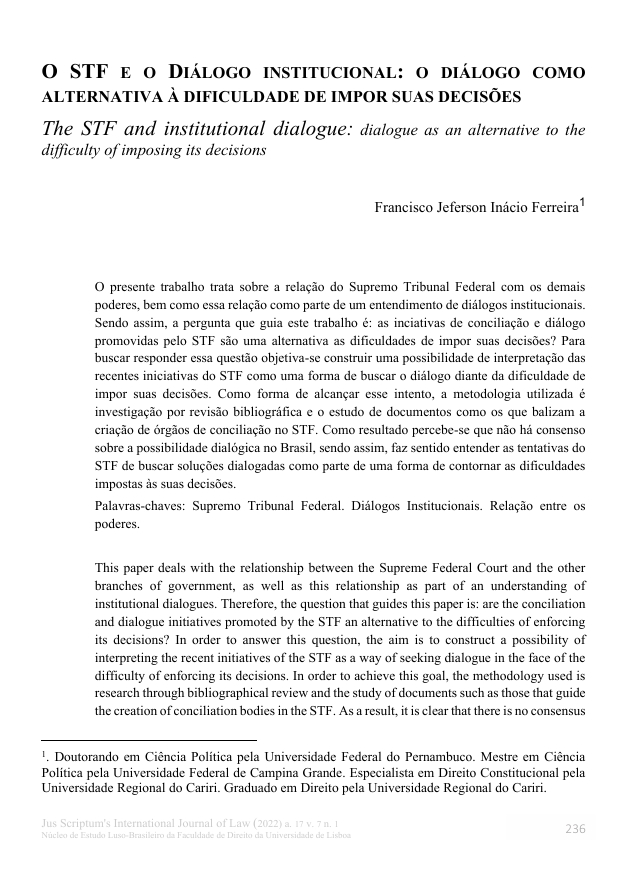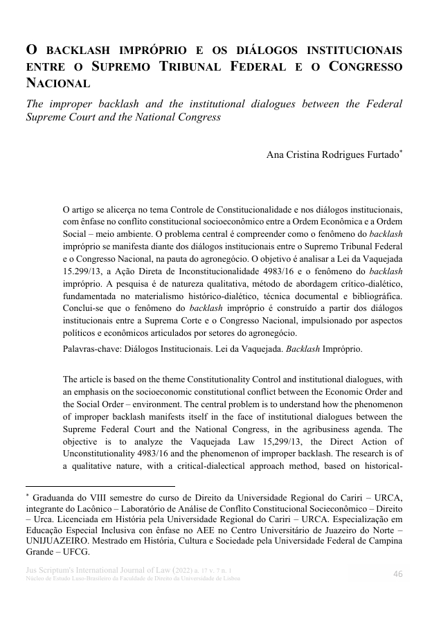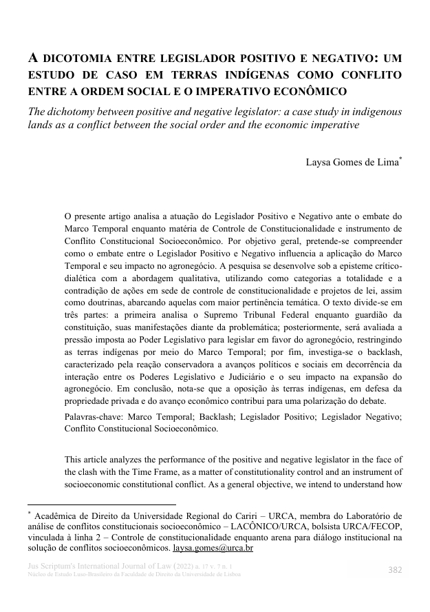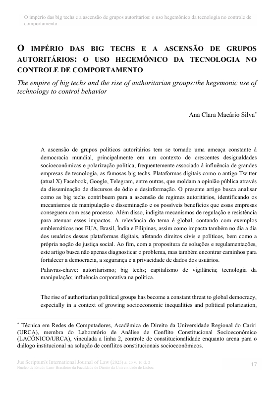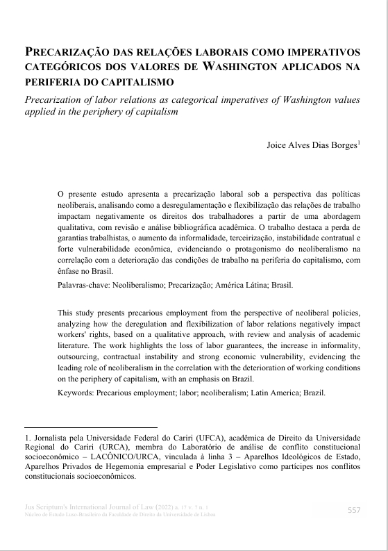Na sua edição especial de 2025, abrangendo o Volume 10, a Jus Scriptum's International Journal of Law, publicação do Núcleo de Estudo Luso-Brasileiro da Faculdade de Direito da Universidade de Lisboa, apresenta os Analíticos do Grupo de Pesquisa em Conflitos Constitucionais Socioeconômicos, coordenado pelo Prof. Dr. Djamiro Ferreira Acipreste Sobrinho em parceria com o LACÔNICO - Laboratório de Análise de Conflito Constitucional Socioeconômico da Universidade Regional do Cariri.