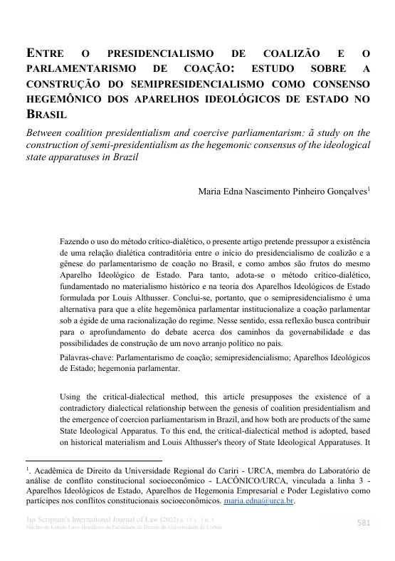 No eixo Neoliberalismo e Aparelhos Ideológicos de Estado, os trabalhos de Jailson Barbosa da Silva, Bárbara Costa Leão, Ana Clara Macário Silva, Rômulo Dornelas Pereira, Sinhara Sthefani Diógenes Dantas, Gênia Darc de Oliveira Pereira, Joice Alves Dias Borges e Maria Edna Nascimento Pinheiro Gonçalves analisam a dimensão racial e de gênero dos conflitos constitucionais, a lógica das privatizações, o poder das big techs, a precarização das relações laborais e a construção do semipresidencialismo como consenso hegemônico dos aparelhos ideológicos de Estado.