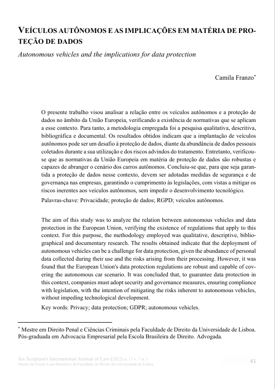 "Veículos autónomos e as implicações em matéria de proteção de dados", de Camila Franzo – Analisa tecnologias (LiDAR, IA, Big Data), benefícios (segurança viária), riscos (20TB/dia de dados pessoais, cibersegurança) e adequação do RGPD a veículos SAE níveis 3-5.
