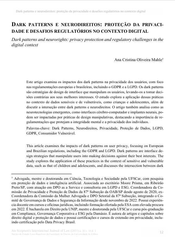 "Dark patterns e neurodireitos: proteção da privacidade e desafios regulatórios no contexto digital", de Ana Cristina Oliveira Mahle – Examina impactos dos dark patterns na privacidade, com foco em dados sensíveis de vulneráveis (crianças/adolescentes), interseção com neurodireitos (privacidade cognitiva, integridade psicológica) e comparação regulatória Europa/Brasil/Chile/EUA.