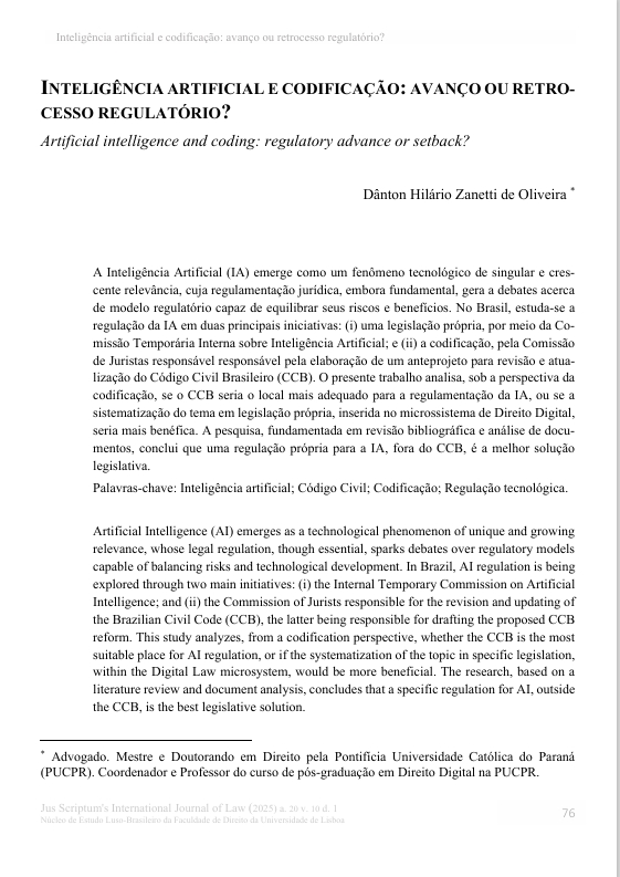 "Inteligência artificial e codificação: avanço ou retrocesso regulatório?", de Danton Hilário Zanetti de Oliveira – Debate regulação da IA no anteprojeto de reforma do Código Civil Brasileiro (CJCCIVIL), defendendo microssistema de Direito Digital vs. codificação/recodificação.
